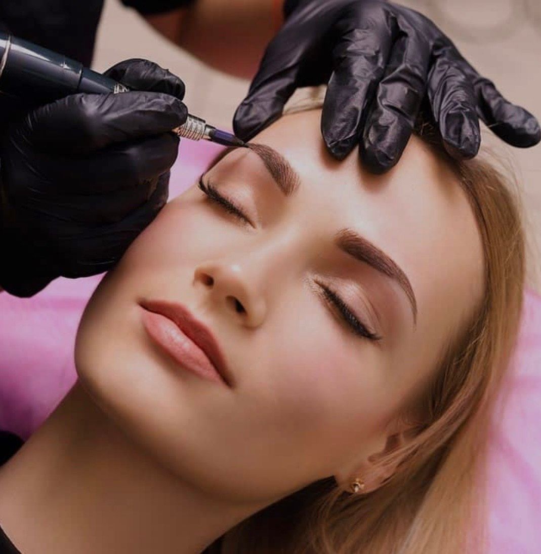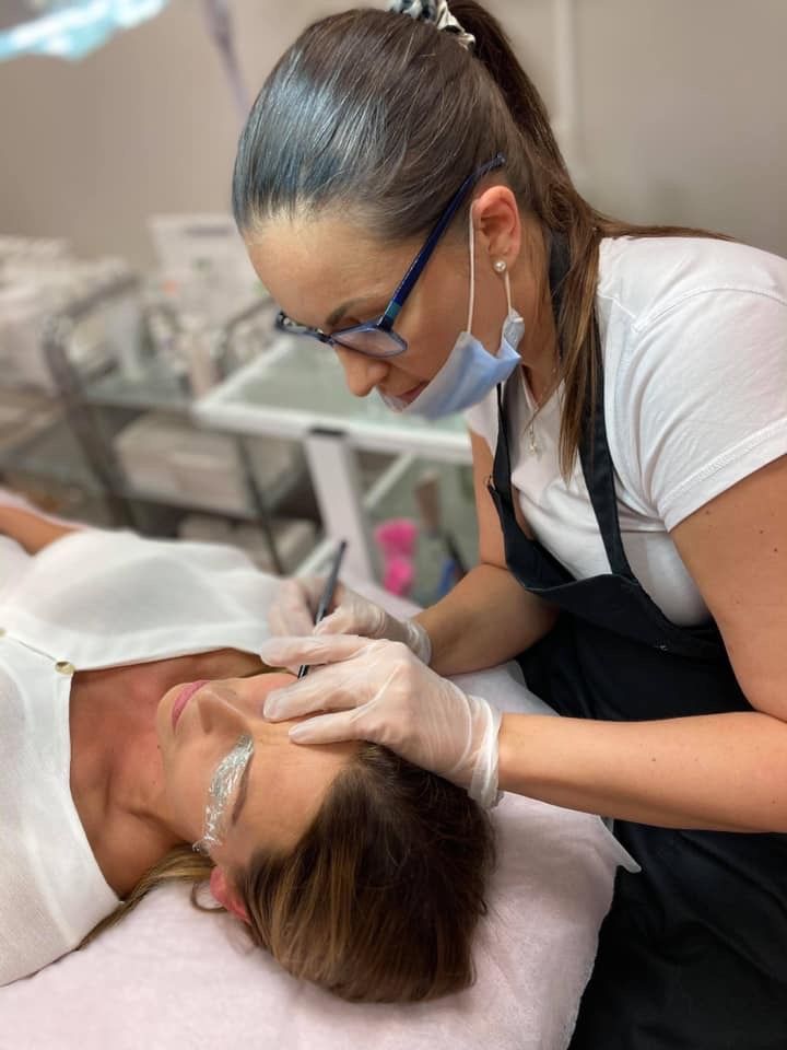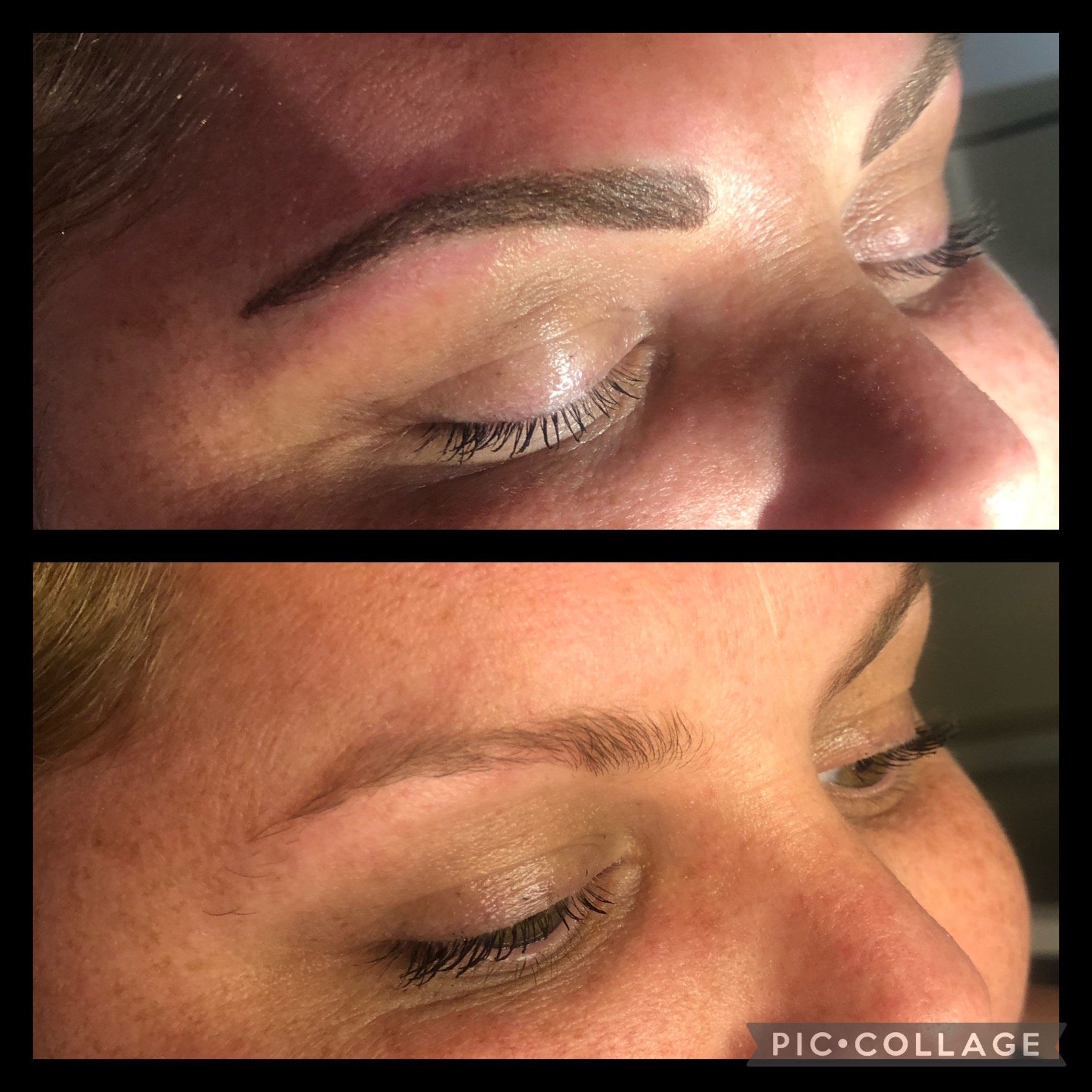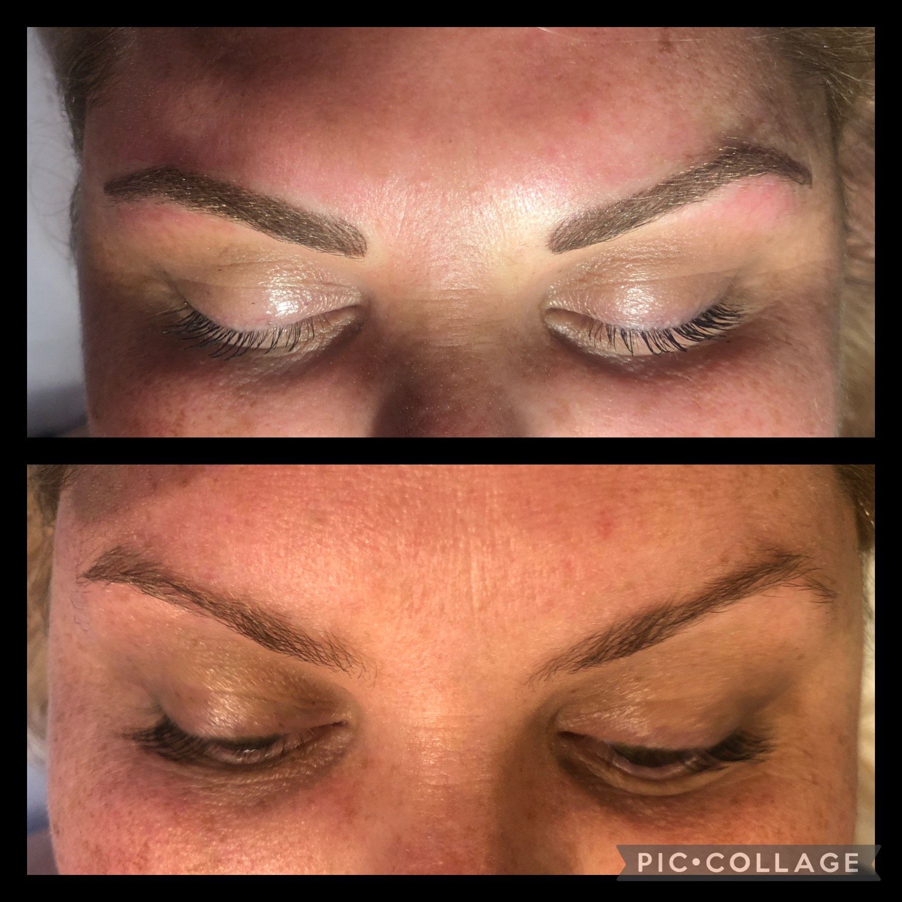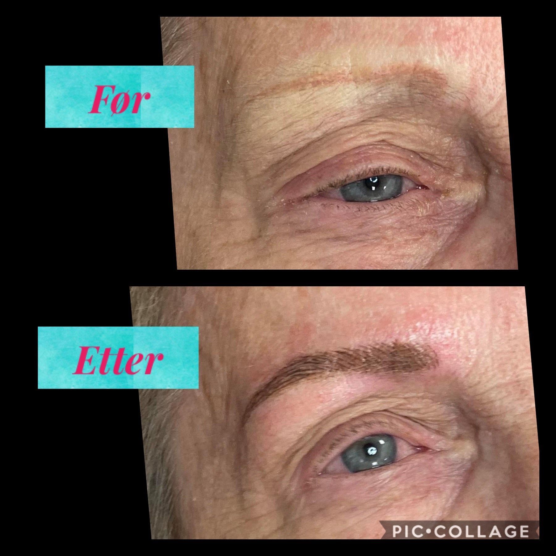 Her ser vi en kunde som har en del hår på brynene sine. Men de er ikke så markerte som hun ønsker. Derfor tatoverer man her to teknikker, hårpåtegning og skygge i dette tilfelle.